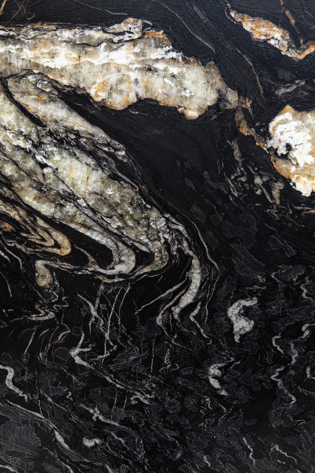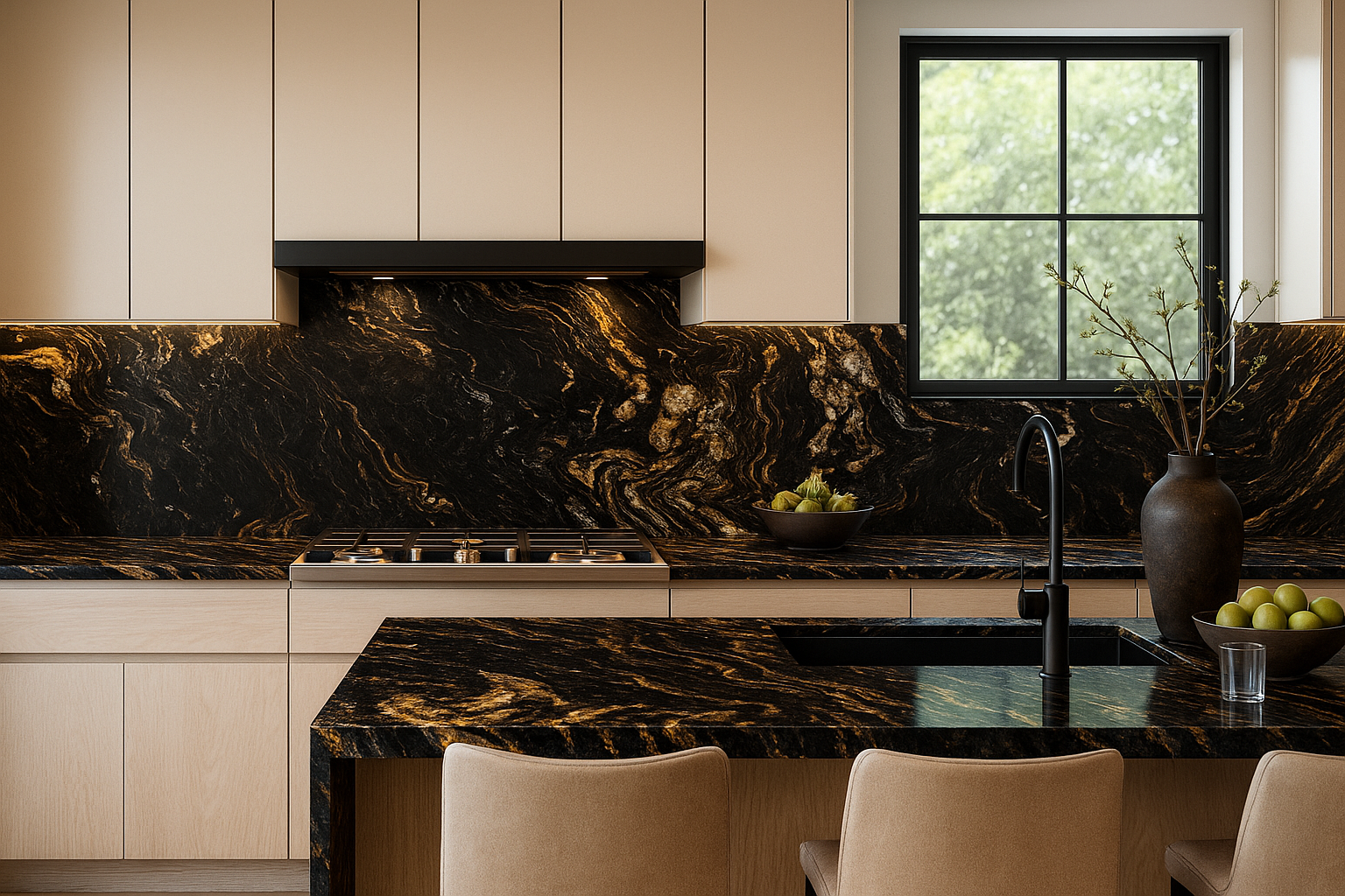 Titanium Granite, showcasing deep black tones layered with flowing veins of white, silver, and gold. The leathered finish enhances its natural movement and tactile depth, offering a refined matte texture that highlights every swirl and shimmer. Ideal for modern kitchens, feature walls, and fireplaces.