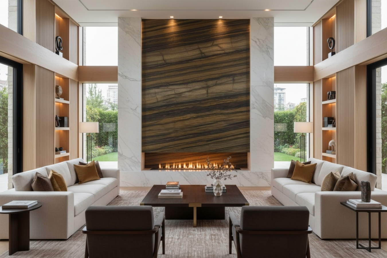 Sandalous Quartzite in its leathered finish brings out the natural depth and texture of this captivating Brazilian stone. Its rich golden-brown base is crossed with dark espresso and chestnut veining, creating a dramatic, wood-like flow that exudes organic luxury. The tactile matte surface enhances its earthy elegance, making it perfect for fireplace surrounds, kitchen islands, and accent walls where texture and warmth meet strength and durability.
